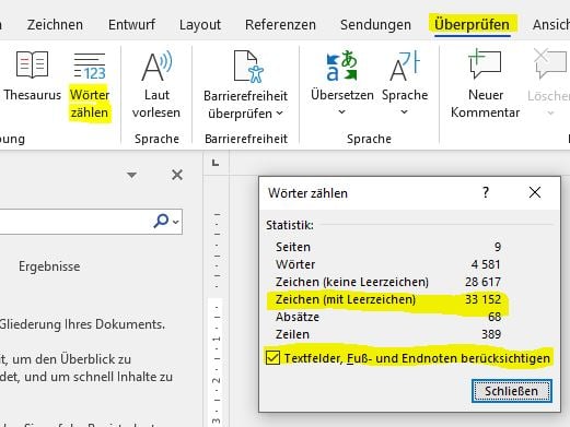 Gehe dabei bitte oben auf "Überprüfen". Klicke dann auf "Wörter zählen" und setze ein Häkchen bei "Textfelder, Fuß- und Endnoten berücksichtigen". Die Zahl, die unter "Zeichen (mit Leerzeichen)" aufscheint, teilst du durch 1 500 und schon hast du die Normseitenzahl deiner Bachelorarbeit.